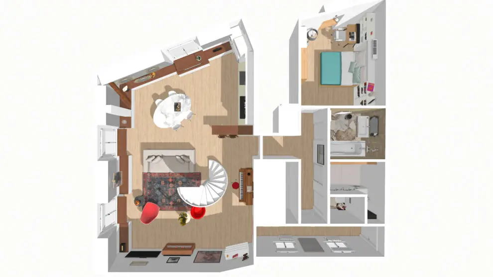 A beautiful staircase leads upstairs to a work area with a desk and then to the hallway leading to the shower room and the second bedroom.
