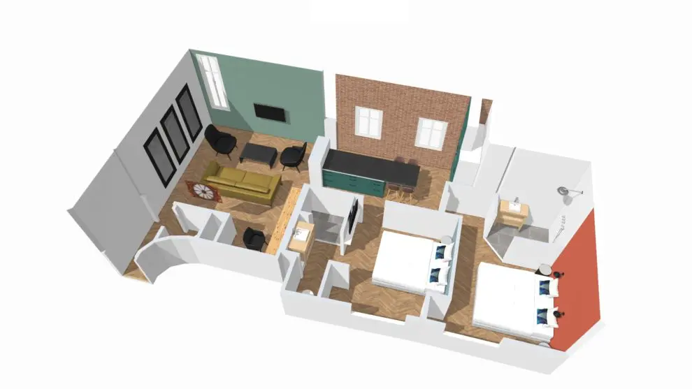 The apartment comprises three rooms: a fully renovated living room in a 16th-century building, with a 20th-century extension housing the open kitchen and bedrooms.