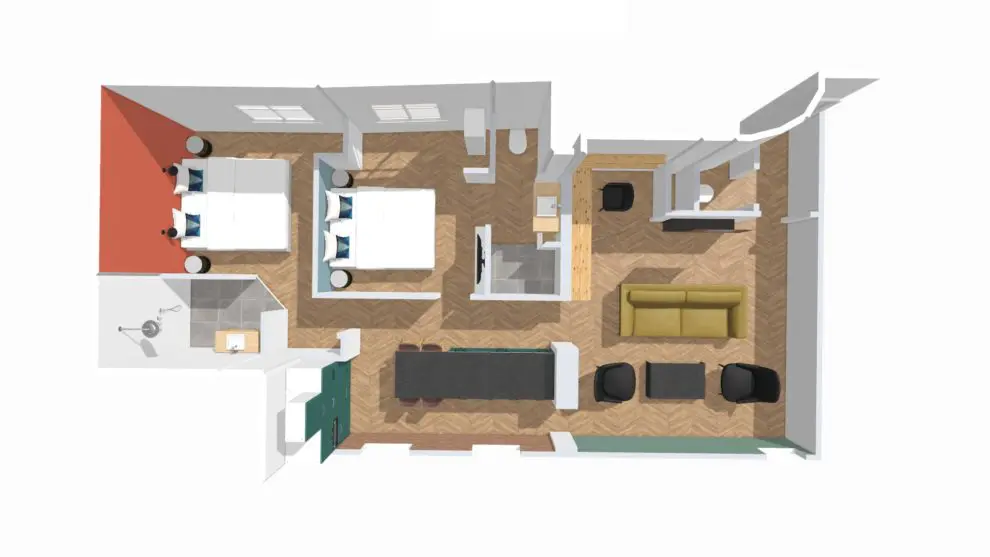 The apartment offers two double bedrooms, each with its own bathroom: one with toilet, the other without.