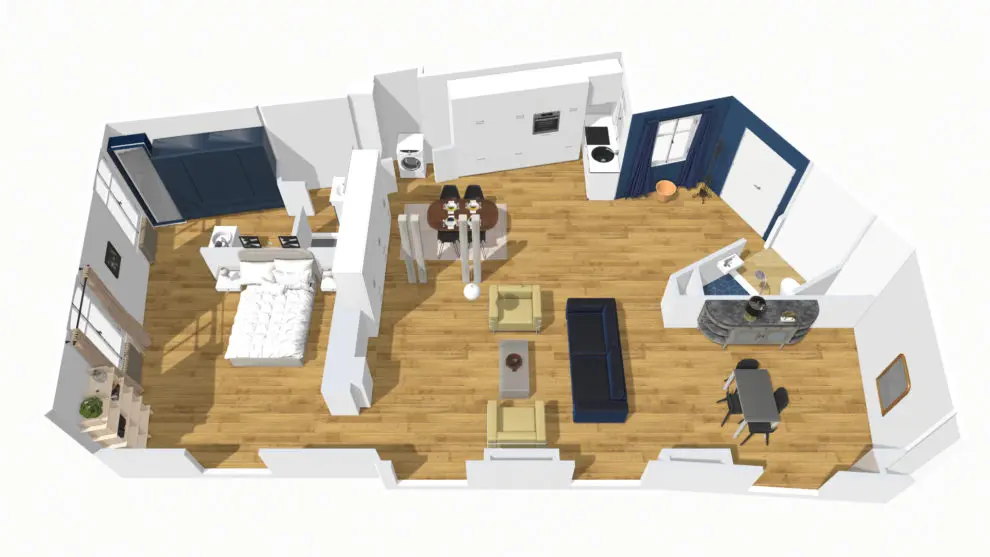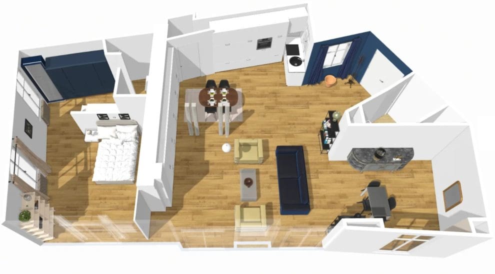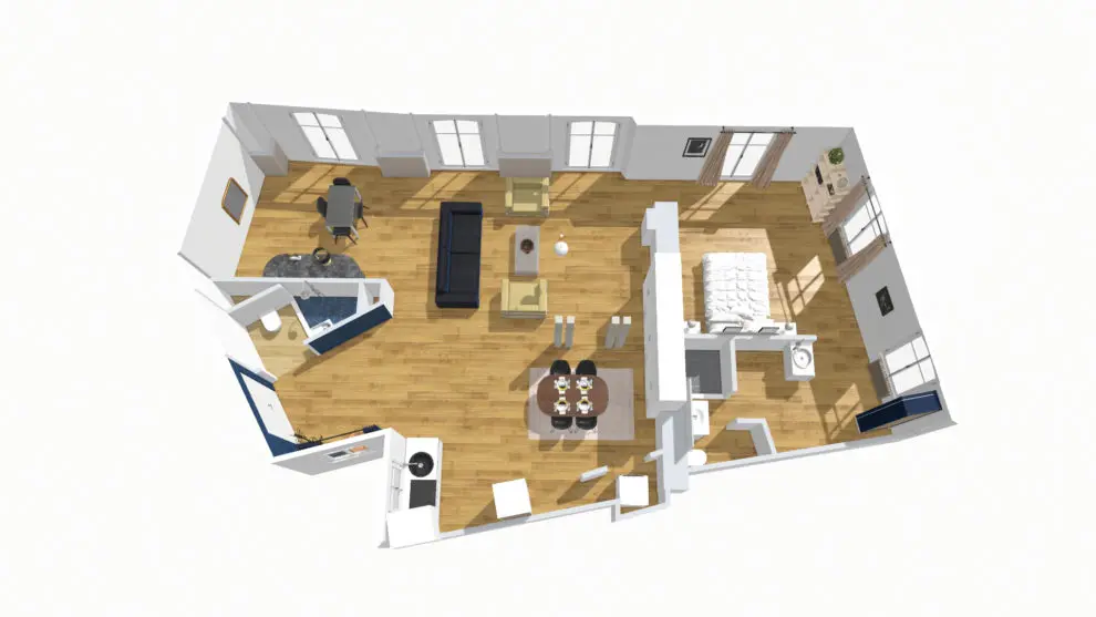 The main area features a kitchen, close to the entrance. A beautiful wooden table comfortably seats four guests. The kitchen opens onto the living room, which consists of both a relaxation area with a sofa and two designer armchairs and an office area with a view of the square.