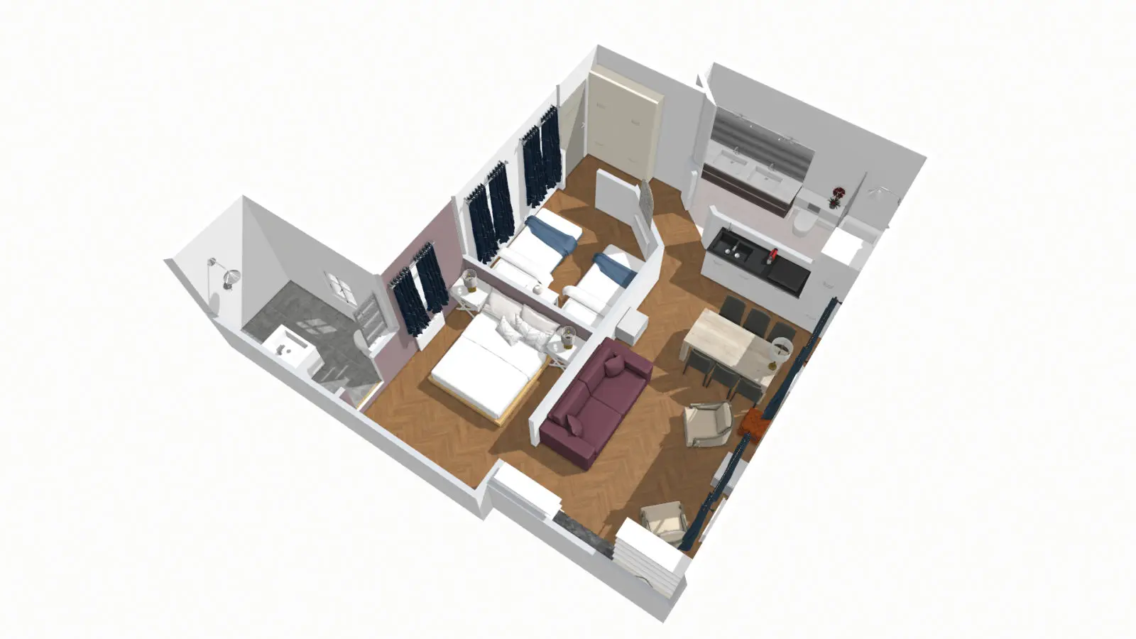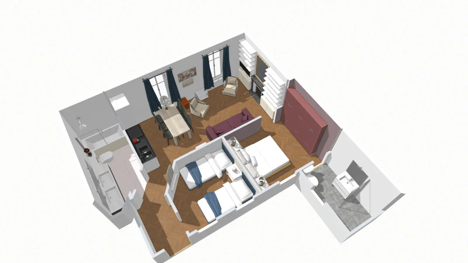 Composed of an entrance hall, a living room with 2 double glazed windows, a fully equipped kitchen with a dining table for six people, two bedrooms with storage space and each with its own bathroom (including a toilet).