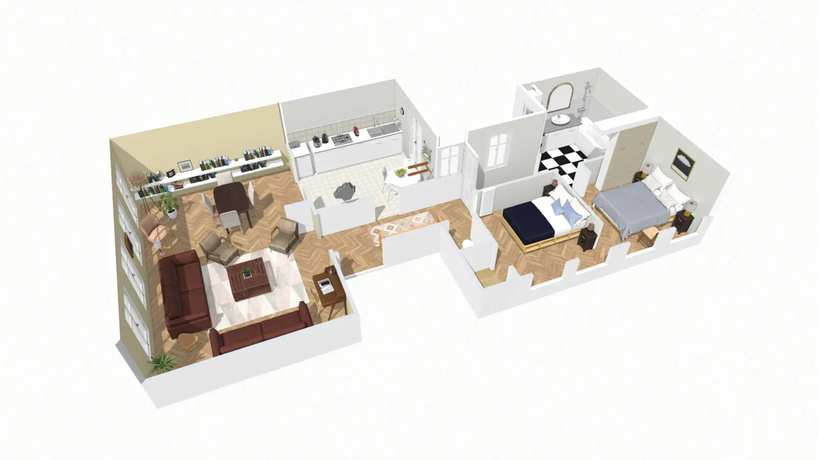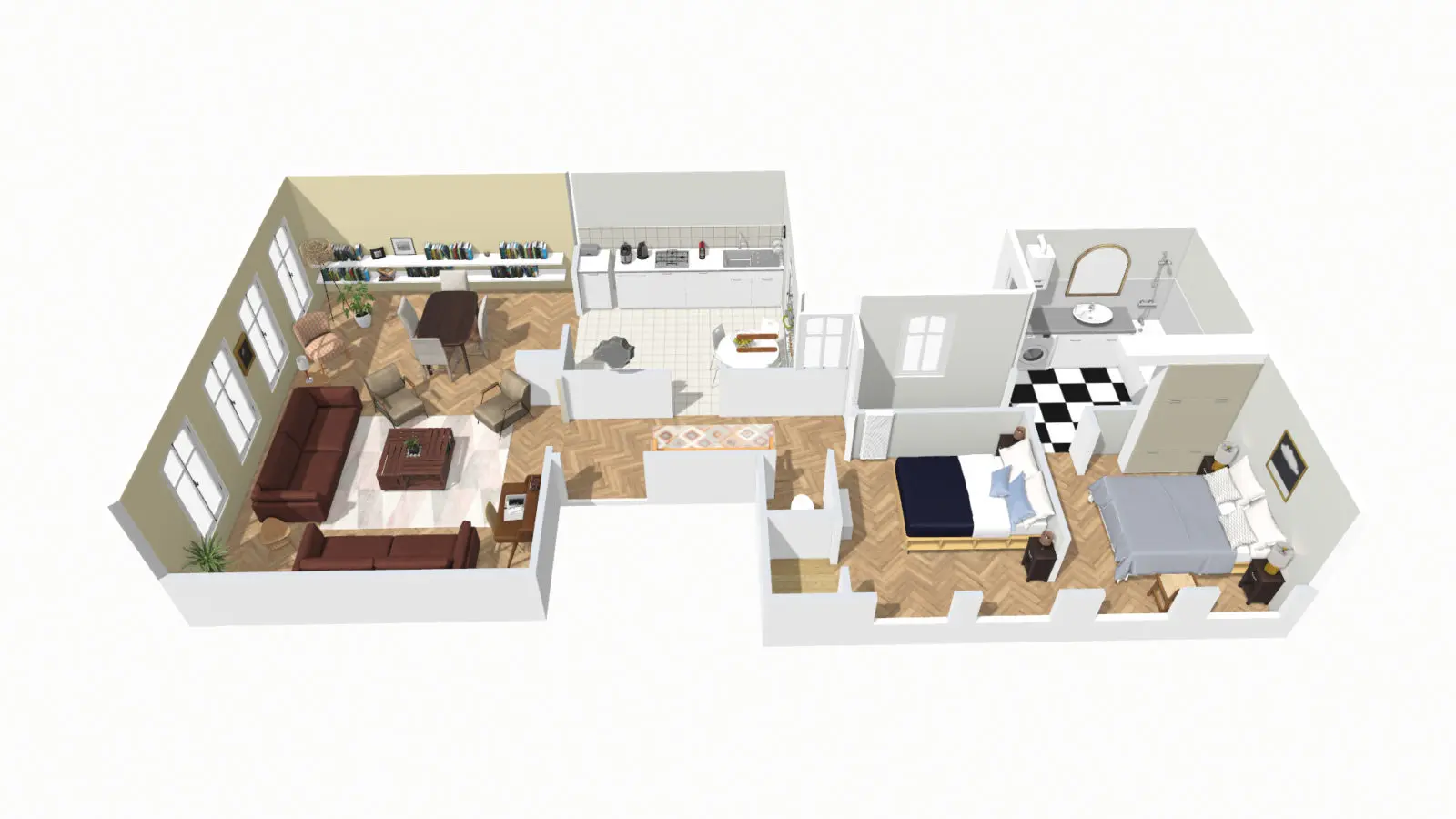 It comprises a kitchen and a double living room overlooking Rue Saint Placide, two bedrooms with 160x200cm and 140x190cm beds, a bathroom and a separated toilet.