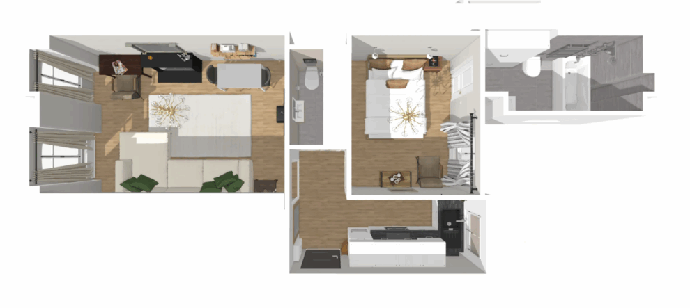 It has a large living room, a full kitchen and a bedroom with a large bathroom.