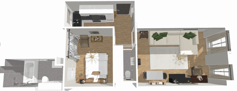 On the left, the large living room that can comfortably accommodate 4 people. The living room has a TV corner and a work space. The large windows bring a lot of light to the room.
