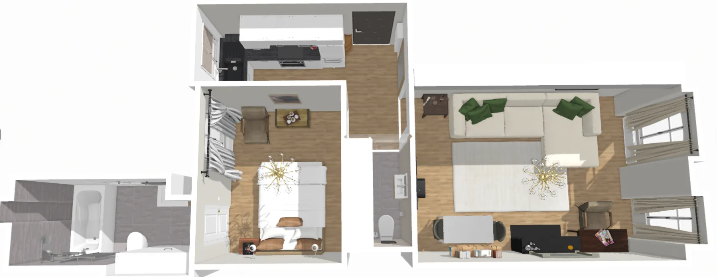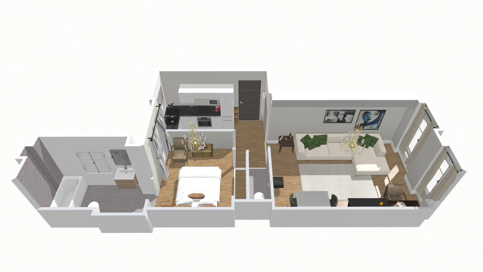 It has a large living room, a full kitchen and a bedroom with a large bathroom.