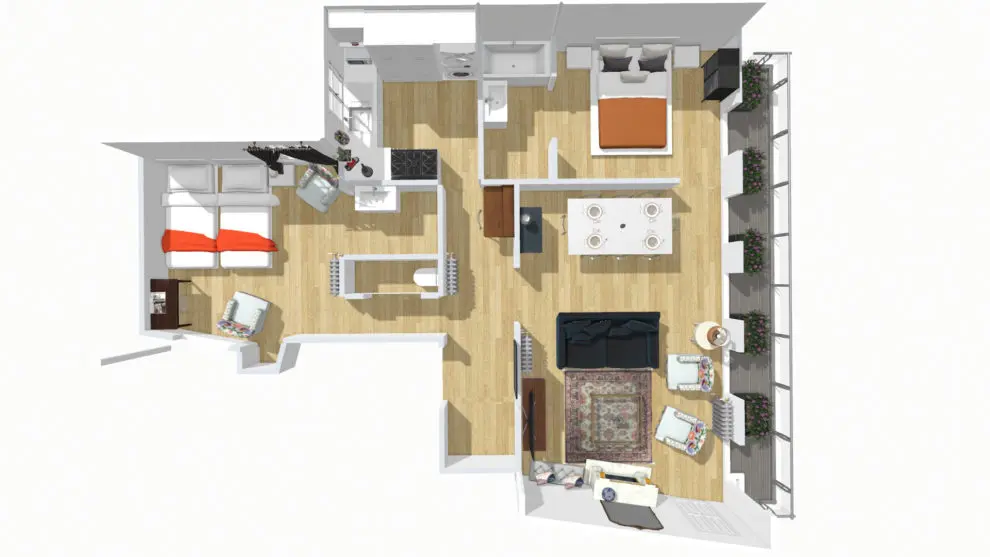 The balcony is decorated with numerous plants and has an automatic watering system.