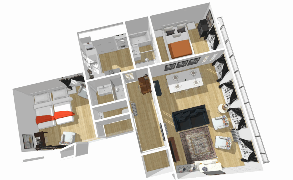 The two bathrooms are en-suite to the bedrooms. The first is equipped with a large shower, sink, and towel dryer, while the second has a shower, sink, and bathtub.