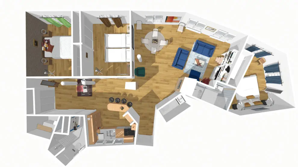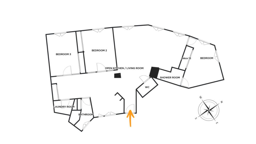 Une deuxième salle de bains avec douche, deux lavabos et toilettes est disponible pour les deux chambres doubles. Il y a également des toilettes séparées à l’entrée.