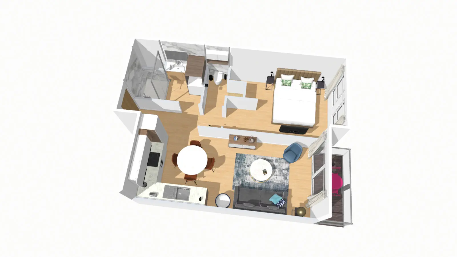 La cuisine entièrement équipée vous permettra de préparer vos repas avec facilité, et la salle de bains moderne propose une douche à l’italienne très spacieuse.
