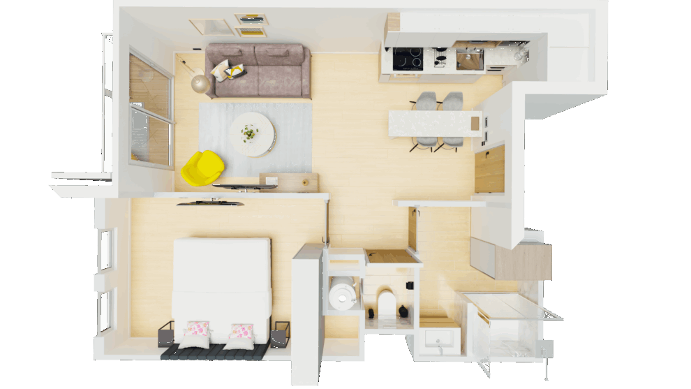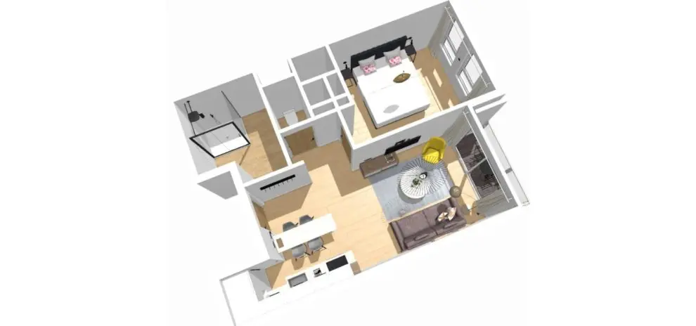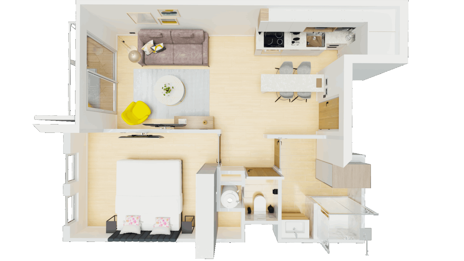 La chambre à coucher offre une parfaite tranquillité avec un lit confortable en180x200cm et des rangements intelligemment intégrés. La climatisation et la TV située face au lit vous offriront un confort supplémentaire. La salle de bains attenante dispose d’une douche à l’italienne et de finitions haut de gamme pour votre confort.