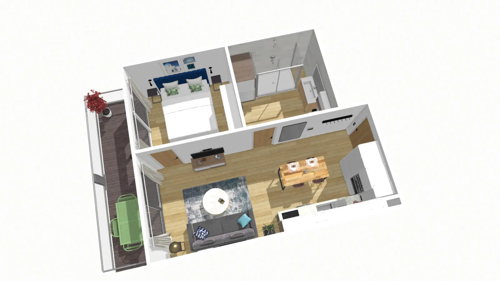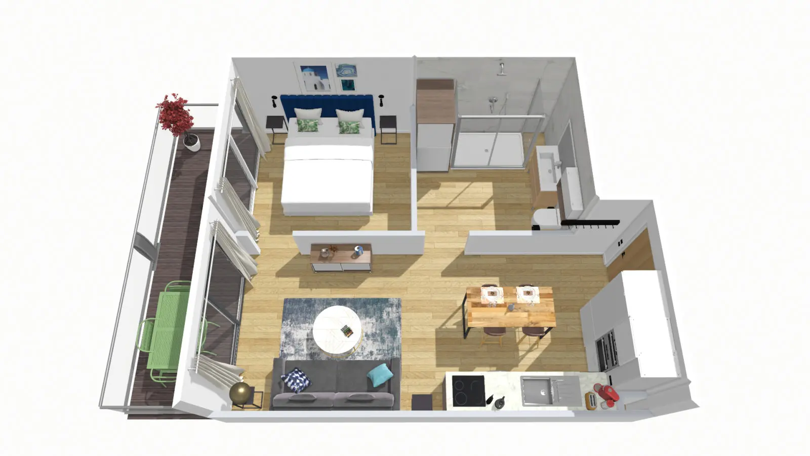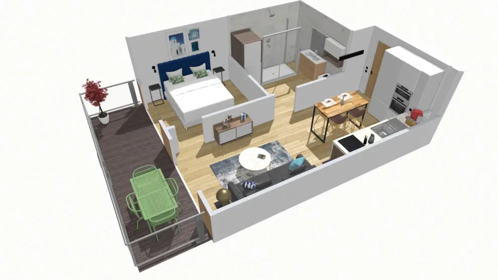 La chambre lumineuse avec balcon et grande TV, offre un lit queen size en 160x200cm et une grande armoire encastrée.