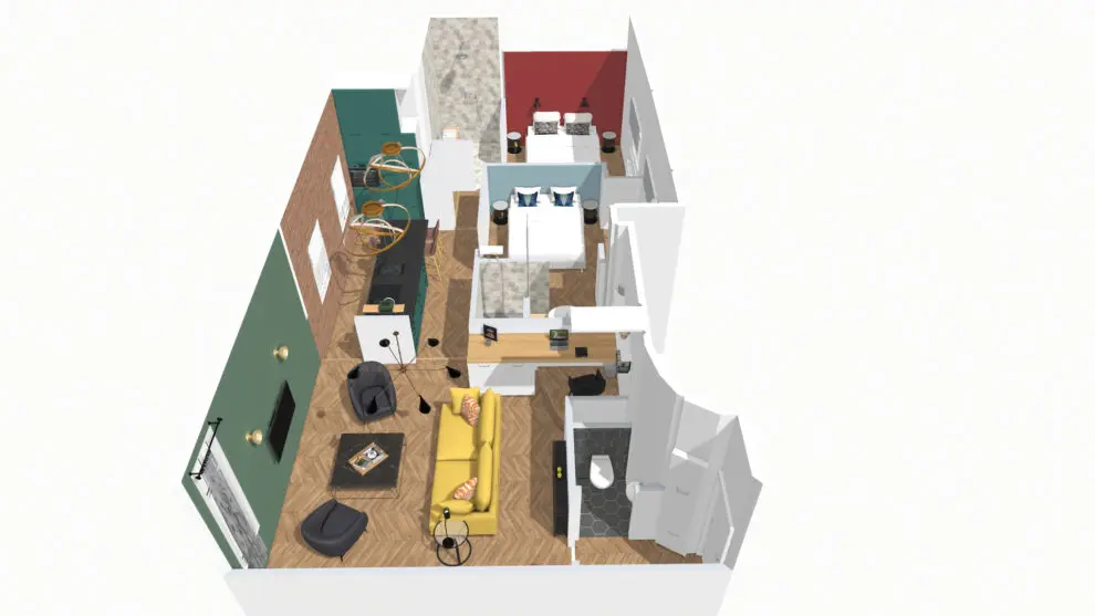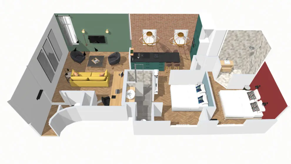 L’appartement offre deux chambres doubles, chacune avec sa propre salle d’eau : l’une avec toilette, l’autre sans.