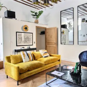 L’appartement se compose de trois pièces : un salon entièrement rénové dans un immeuble du 16e siècle, avec une extension du 20e siècle abritant la cuisine ouverte et les chambres. Cette configuration originale permet de profiter à la fois du premier étage et du dernière étage de l’immeuble, offrant une luminosité exceptionnelle et un calme absolu, car les chambres donnent sur la cour intérieure.