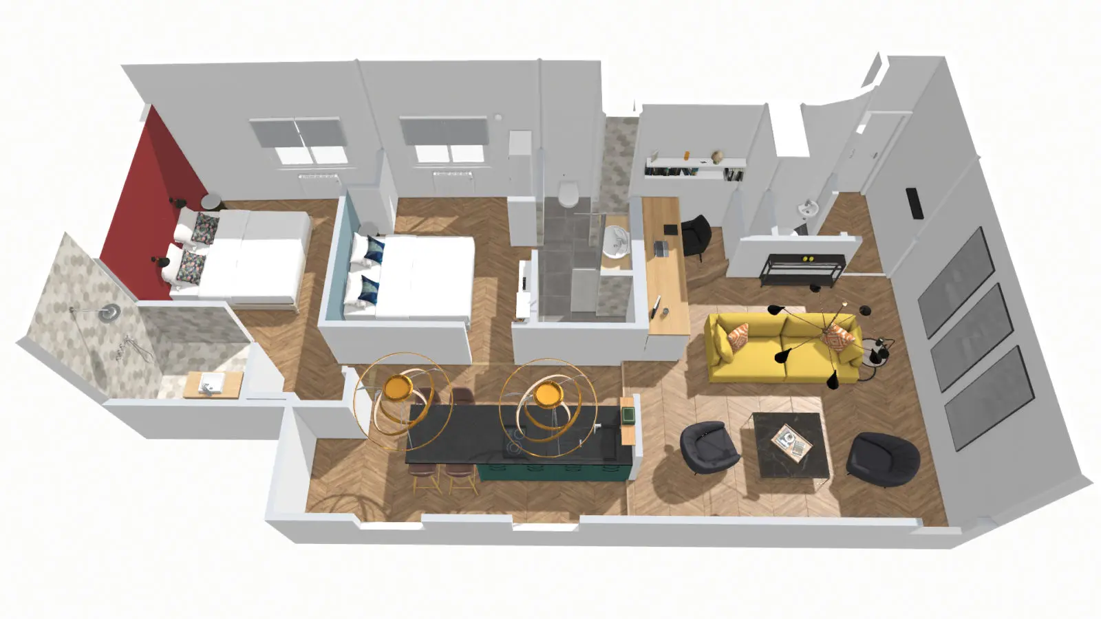L’appartement offre deux chambres doubles, chacune avec sa propre salle d’eau : l’une avec toilette, l’autre sans.