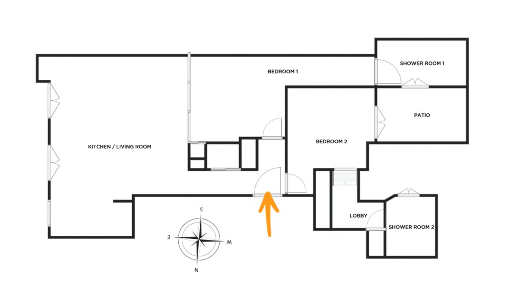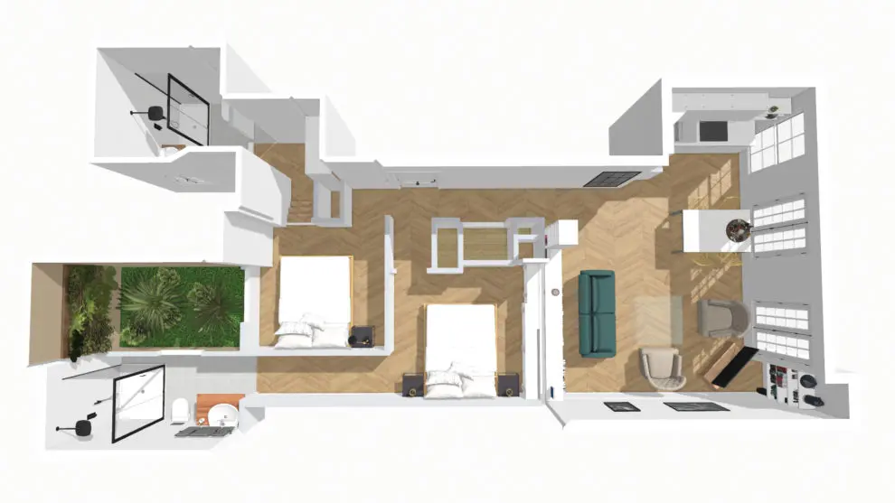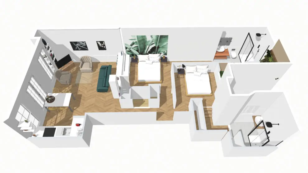 Il dispose de deux chambres, chacune avec 2 lits queen size 160x200cm et des salles d’eaux attenantes équipées d’une douche, d’un lavabo et d’un WC.