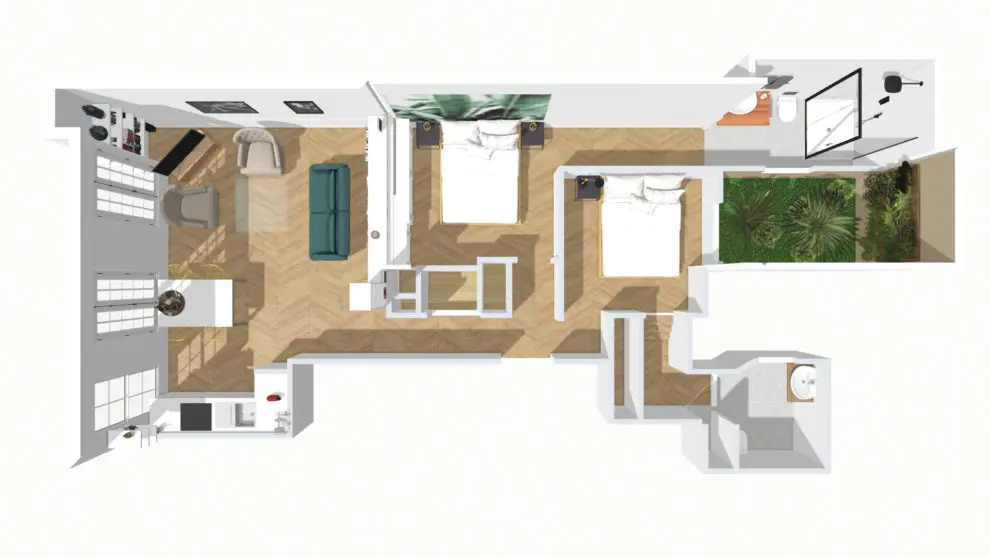 La deuxième chambre s’ouvre sur un petit patio. Sa salle d’eau est accessible en descendant quelques marches et aussi équipée d’une douche, d’un lavabo, d’un WC ainsi que d’une machine à laver et un sèche-linge.