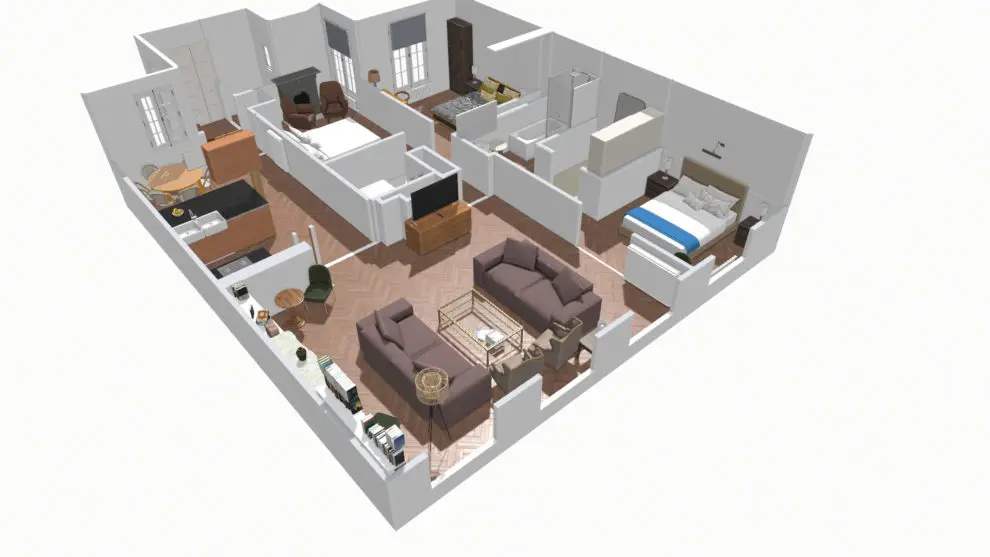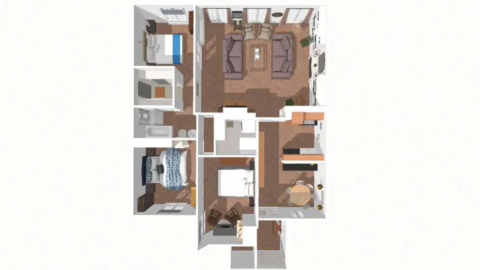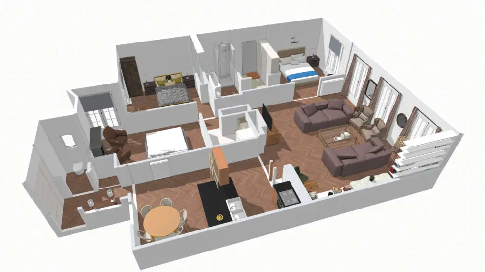 Les deux autres chambres avec des lits en 160x200cm et 140x190cm, partagent une salle de douche sans toilettes, le toilette est séparé et se trouve à l’entrée de l’appartement.